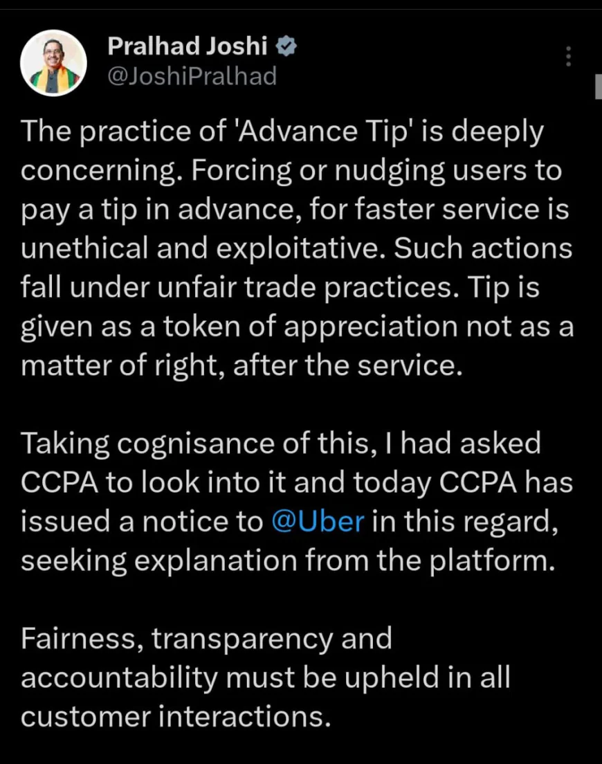 उन्होंने बताया कि इस पर संज्ञान लेते हुए उन्होंने CCPA (केंद्रीय उपभोक्ता संरक्षण प्राधिकरण) को कार्रवाई के निर्देश दिए हैं और अब CCPA ने Uber को नोटिस जारी कर जवाब मांगा है।