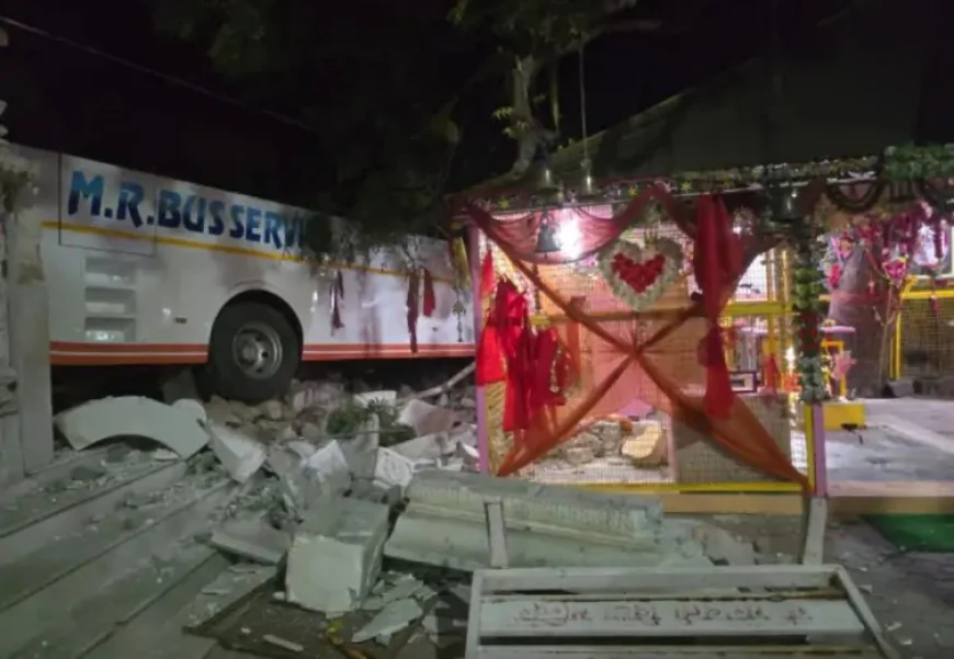 बाड़मेर में भीषण बस हादसा: टायर फटने से अनियंत्रित बस मंदिर की दीवार में घुसी, 12 घायल; ड्राइवर को JCB से निकाला, लोहे की चादर तोड़ी