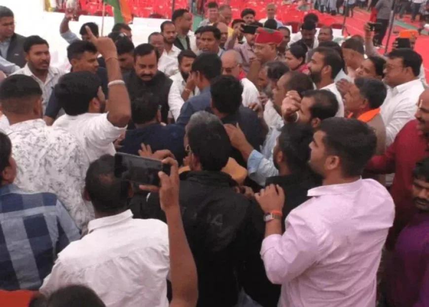 भरतपुर के उच्चैन में वंदे मातरम 150 वर्ष कार्यक्रम के दौरान बीजेपी कार्यकर्ताओं ने SDM के खिलाफ नारेबाजी की, कलेक्टर ने मंत्री सुरेश रावत को सुरक्षित गाड़ी तक पहुंचाया।