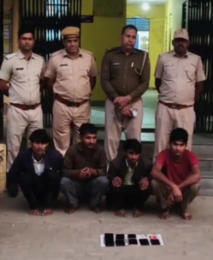 डीग पुलिस ने जानवर बेचने के नाम पर सोशल मीडिया पर फर्जी अकाउंट बनाकर ठगी करने वाले 4 आरोपियों को पकड़ा; 8 चोरी के मोबाइल, फर्जी सिम और बाइक बरामद।