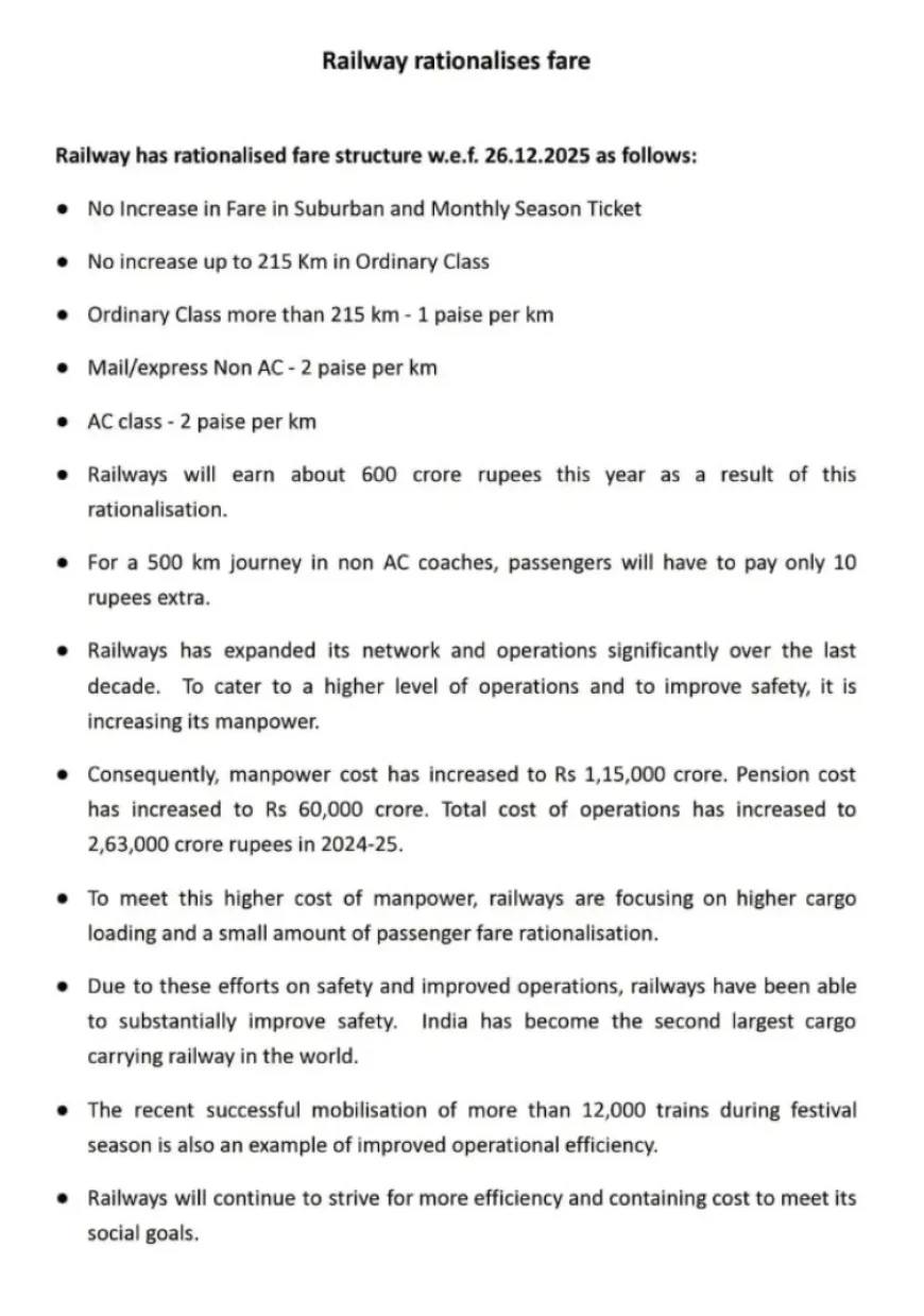 भारतीय रेलवे ने 26 दिसंबर 2025 से लंबी दूरी की ट्रेनों के किराए में मामूली बढ़ोतरी की घोषणा की है। 215 किमी से अधिक दूरी पर साधारण क्लास में 1 पैसा प्रति किमी और मेल/एक्सप्रेस की नॉन-एसी तथा सभी एसी क्लास में 2 पैसे प्रति किमी अतिरिक्त लगेगा। इससे रेलवे को सालाना करीब 600 करोड़ रुपये की अतिरिक्त आय होगी। छोटी दूरी (215 किमी तक), लोकल ट्रेनें और मंथली सीजन टिकट पर कोई बढ़ोतरी नहीं। यह बढ़ोतरी परिचालन लागत और इंफ्रास्ट्रक्चर विकास के लिए जरूरी बताई गई है।