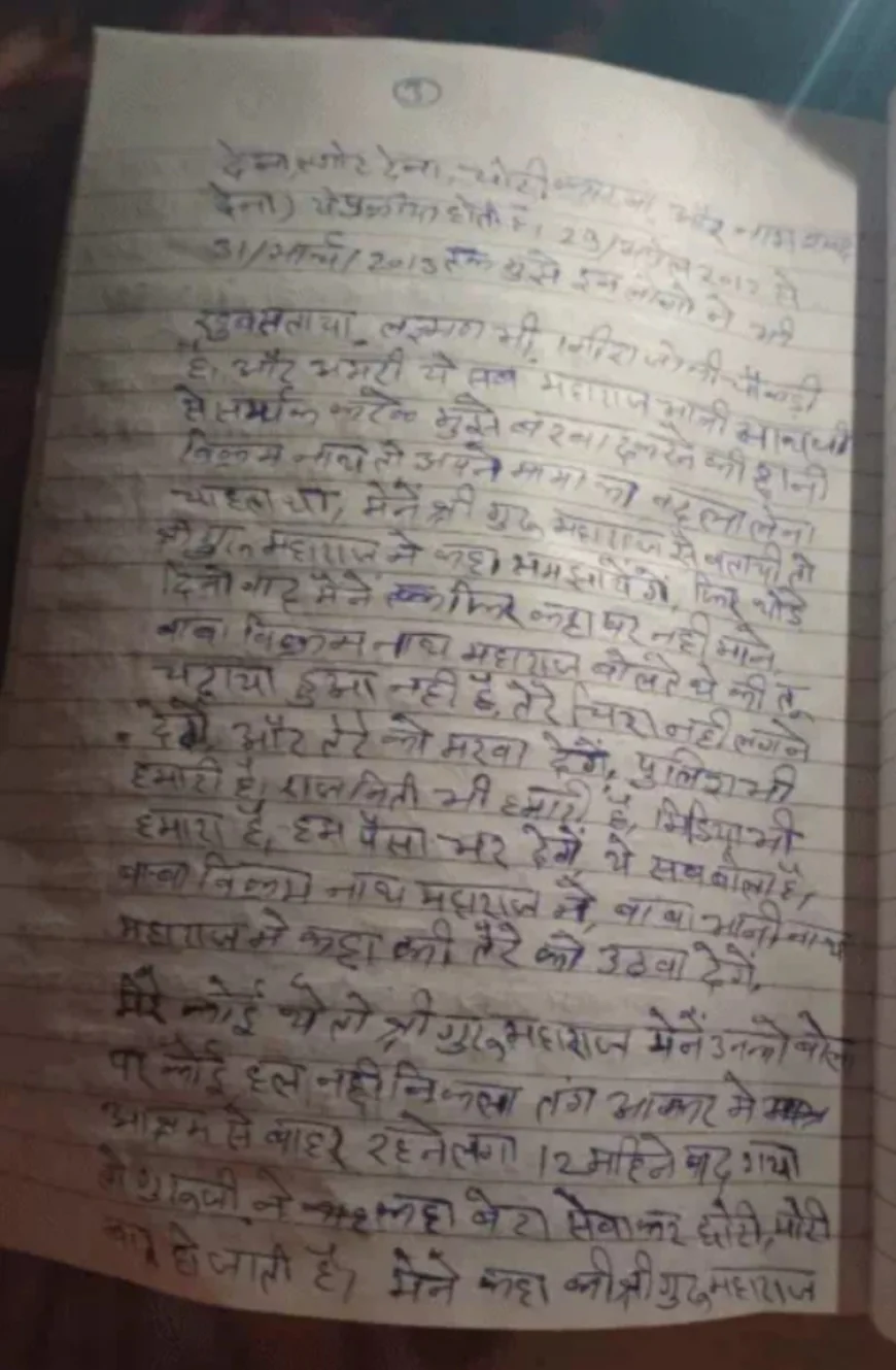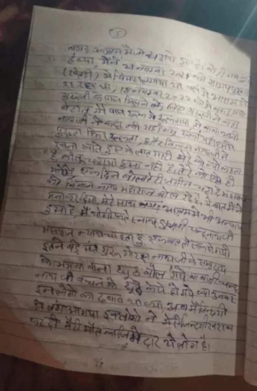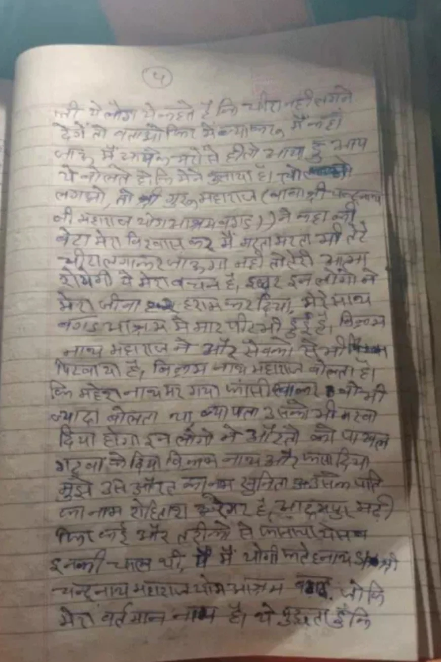 साधु की पहचान और पृष्ठभूमि मृतक साधु की पहचान फतेहनाथ (उम्र 30 वर्ष) पुत्र गिरधारी लाल, निवासी नागला नाथुसर के रूप में हुई है। वे 2021 से पपुराना की पहाड़ी पर स्थित आश्रम में धूणा लगाकर अकेले रह रहे थे। सुसाइड नोट और वीडियो में फतेहनाथ ने अपना बचपन का नाम फतेहचंद बताया। उनके अनुसार, जब वे मात्र छह महीने के थे, तभी उनके पिता गिरधारी लाल का निधन हो गया। इसके बाद उनकी बड़ी बुआ उन्हें कंचनपुर ले आईं, जहां बुआ के बेटे लक्ष्मण ने उन्हें लगातार परेशान किया। पैतृक जमीन और गहनों को लेकर भी उन्हें प्रताड़ित किया गया।