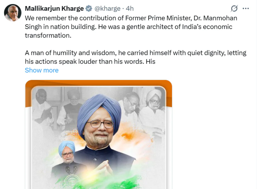 कांग्रेस अध्यक्ष मल्लिकार्जुन खड़गे ने भी डॉ. सिंह को श्रद्धांजलि देते हुए उन्हें भारत के आर्थिक परिवर्तन का वास्तुकार बताया। खड़गे ने 'एक्स' पर लिखा, "डॉ. मनमोहन सिंह विनम्रता और बुद्धिमत्ता के प्रतीक थे। उनके आर्थिक सुधारों ने भारत को वैश्विक मंच पर नई पहचान दिलाई और लाखों लोगों को गरीबी से बाहर निकाला। उनकी विरासत आने वाली पीढ़ियों के लिए प्रेरणा का स्रोत बनी रहेगी।" कांग्रेस ने भी अपने आधिकारिक हैंडल से डॉ. सिंह की समावेशी विकास और राजनीतिक शुचिता की विरासत को सम्मानित किया।