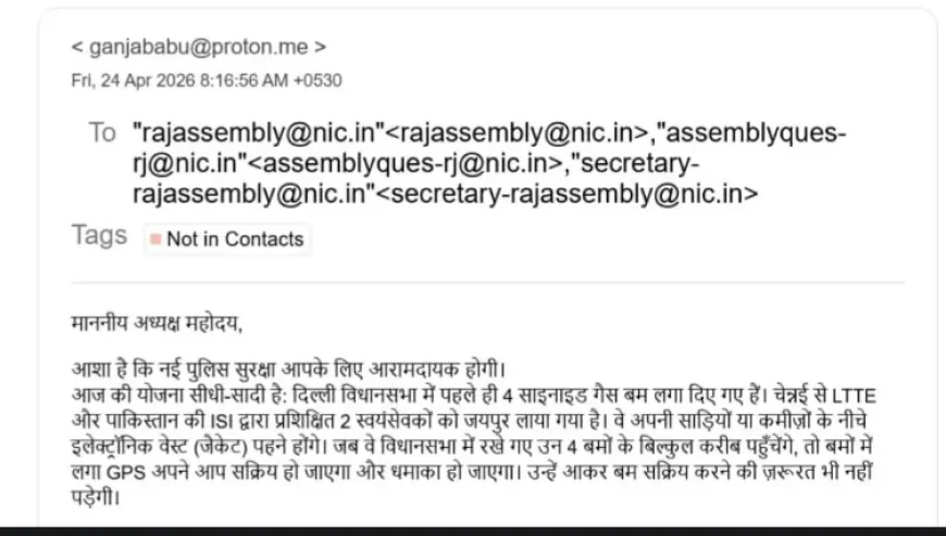 राजस्थान विधानसभा को एक बार फिर बम से उड़ाने की धमकी मिलने से हड़कंप मच गया। शुक्रवार को विधानसभा के आधिकारिक ई-मेल पर भेजे गए एक संदेश में दोपहर 1 बजे आत्मघाती धमाके की चेतावनी दी गई। सूचना मिलते ही प्रशासन और सुरक्षा एजेंसियां तुरंत अलर्ट मोड पर आ गईं।