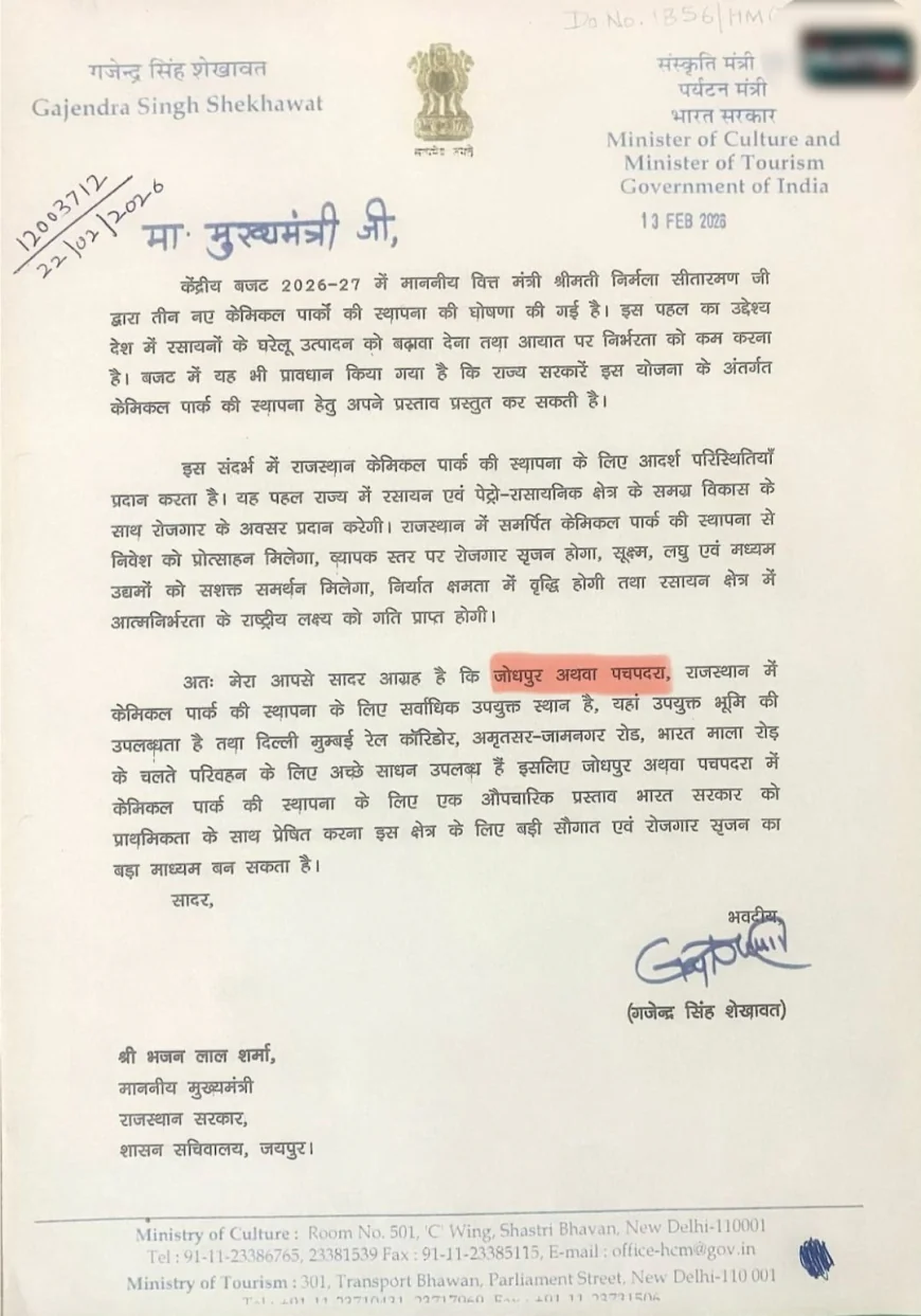 केंद्रीय मंत्री गजेंद्र सिंह शेखावत ने मुख्यमंत्री भजनलाल शर्मा को पत्र लिखकर जोधपुर या पचपदरा में केमिकल पार्क स्थापित करने के लिए प्रस्ताव भेजने का आग्रह किया है। केंद्रीय बजट 2026-27 में घोषित इस योजना से राजस्थान में निवेश, उद्योग और रोजगार के नए अवसर पैदा होने की संभावना है।