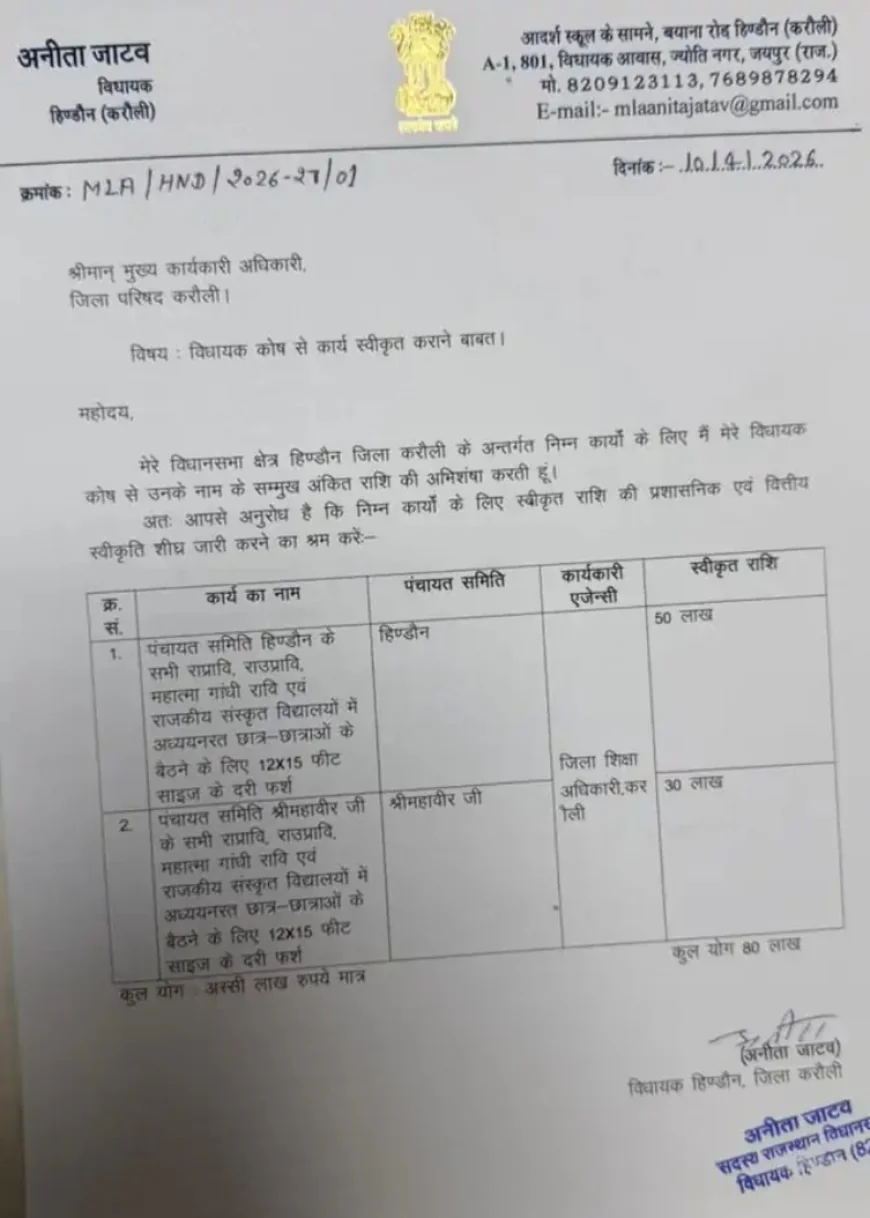 कांग्रेस विधायक अनीता जाटव पर आरोप हिंडौन से कांग्रेस विधायक अनीता जाटव ने कथित रूप से 50 हजार रुपये टोकन मनी लिए। उनके करीबी पवन शर्मा ने बातचीत में 40% तक कमीशन पर सहमति जताई। अनीता ने 80 लाख रुपये के काम का अनुशंसा पत्र दे दिया और जिला परिषद CEO के नाम जारी किया। उन्होंने कहा कि पहले भी काम दिए थे लेकिन अधिकारी अटकाते थे, इसलिए उनको "देख लेना" पड़ेगा।