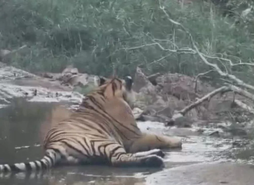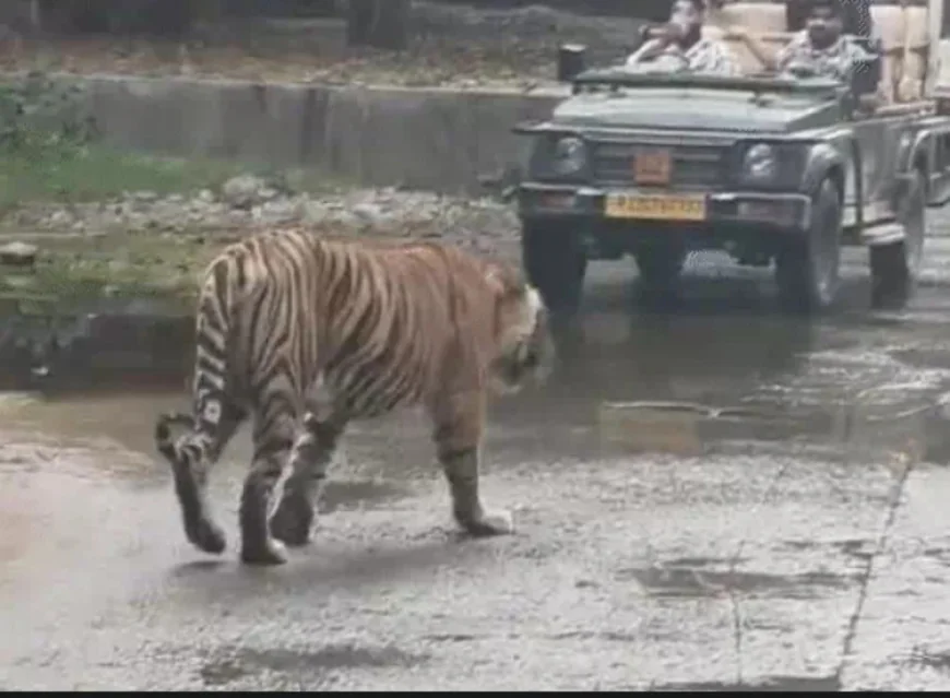सवाई माधोपुर के रणथंभौर टाइगर रिजर्व में बुधवार शाम को एक टाइगर (RBT-2511) त्रिनेत्र गणेश मंदिर मार्ग पर अचानक आ गया और करीब 30 मिनट तक सड़क पर घूमता रहा। टाइगर को देखकर पर्यटकों ने गाड़ियां पीछे हटाईं, वन विभाग ने आवाजाही रोकी। टाइगर पानी में बैठा, फिर एक कार की ओर बढ़ा, जिससे ड्राइवर ने रिवर्स लिया। आधे घंटे बाद टाइगर जंगल लौटा। वीडियो वायरल हो रहा है, जो रणथंभौर में बाघों के बढ़ते मूवमेंट को दिखाता है।