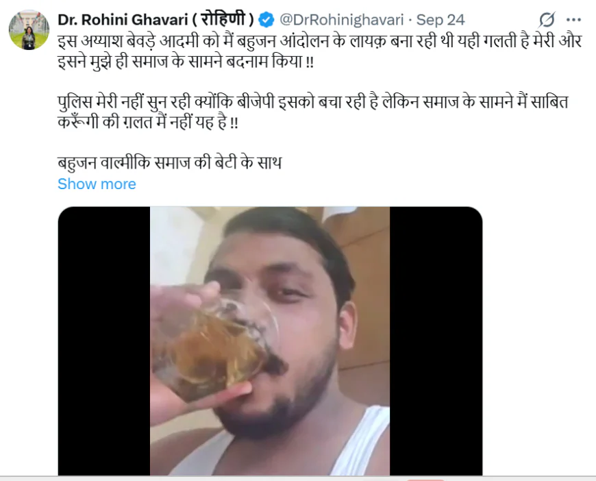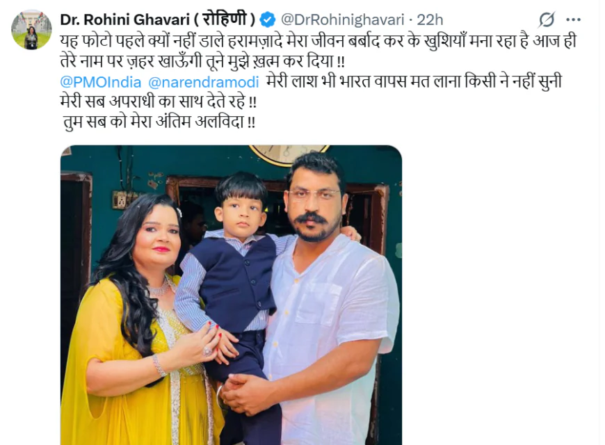 बुधवार को रोहिणी ने X पर कई पोस्ट किए, जिनमें उन्होंने अपनी पीड़ा और हताशा जाहिर की। एक पोस्ट में उन्होंने चंद्रशेखर, उनकी पत्नी और बच्चे की तस्वीर साझा करते हुए लिखा, "मेरा जीवन बर्बाद करके यह खुशियां मना रहा है। आज ही तेरे नाम पर जहर खाऊंगी।" इसके साथ ही उन्होंने कुछ निजी वीडियो साझा किए, जिनमें उन्होंने दावा किया कि चंद्रशेखर ने उन्हें रिश्ते में बांधकर रखा और उनका शारीरिक व भावनात्मक शोषण किया।