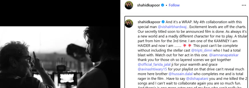 बॉलीवुड के चहेते अभिनेता शाहिद कपूर एक बार फिर मशहूर निर्देशक विशाल भारद्वाज के साथ बड़े पर्दे पर अपनी जादुई केमिस्ट्री दिखाने को तैयार हैं। इस बहुप्रतीक्षित फिल्म की शूटिंग हाल ही में पूरी हुई है, और शाहिद ने सोशल मीडिया पर सेट से एक तस्वीर साझा कर फैंस का उत्साह बढ़ा दिया है। यह फिल्म शाहिद और विशाल के बीच चौथा कोलैबरेशन है, जिसने पहले कमीने, हैदर और रंगून जैसी शानदार फिल्में दी हैं।