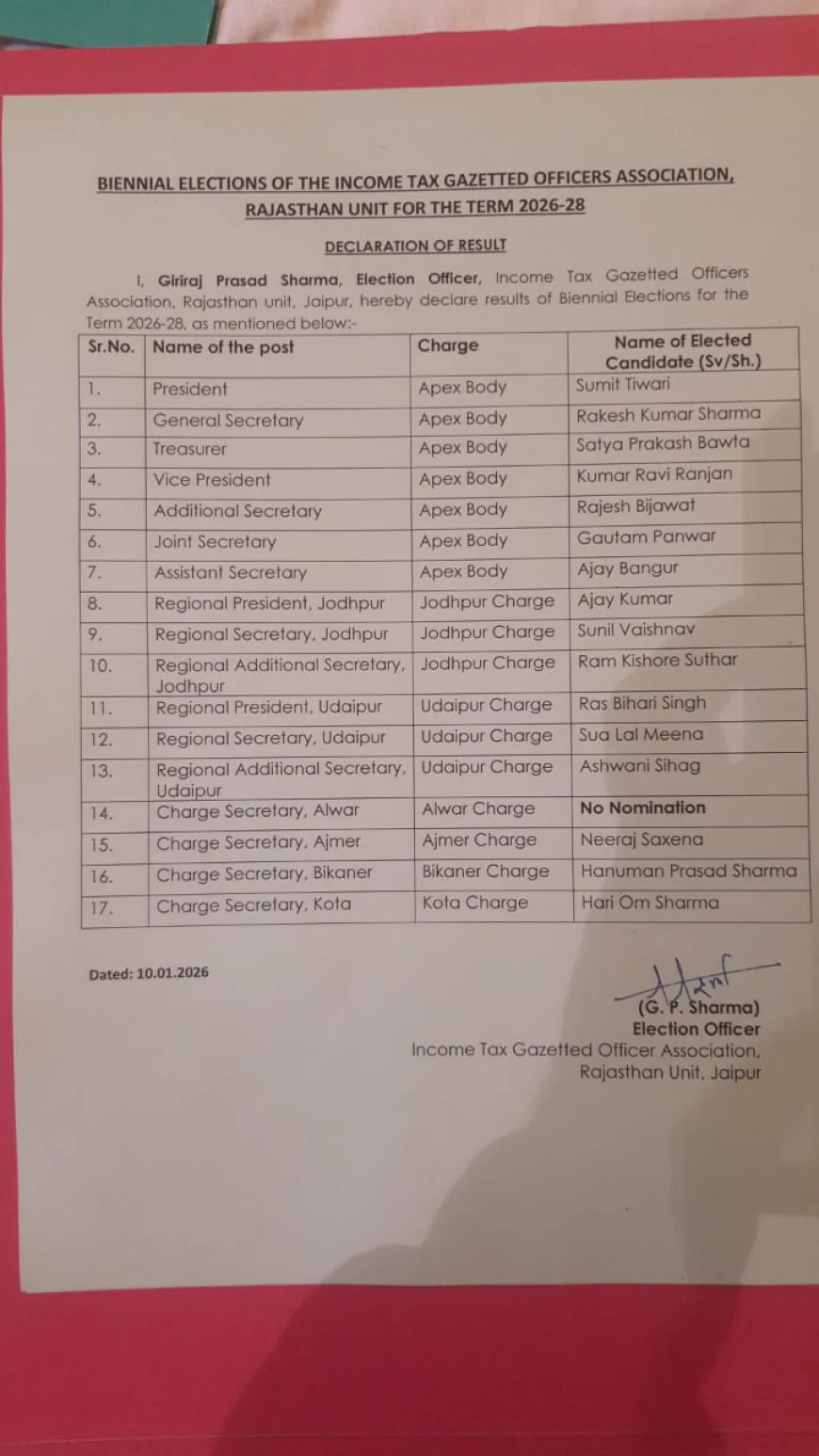 बहरोड़/जयपुर, 11 जनवरी 2026 — इनकम टैक्स गैजेटेड ऑफिसर्स एसोसिएशन (ITGOA) की राजस्थान इकाई के अध्यक्ष पद के लिए हुए चुनाव में श्री सुमित तिवारी को निर्विरोध रूप से चुना गया है। यह चुनाव जयपुर में आयोजित किया गया, जिसमें आयकर विभाग के वरिष्ठ अधिकारी, संगठन के पूर्व पदाधिकारी, सहकर्मी और ITGOA परिवार के सदस्य बड़ी संख्या में उपस्थित रहे।