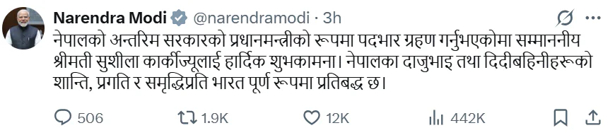पीएम मोदी ने लिखा:- "नेपाल की अंतरिम सरकार की प्रधानमंत्री के रूप में पद ग्रहण करने पर माननीय सुशीला कार्की जी को हार्दिक शुभकामनाएं। नेपाल के भाई-बहनों की शांति, प्रगति और समृद्धि के लिए भारत पूरी तरह से प्रतिबद्ध है।"
