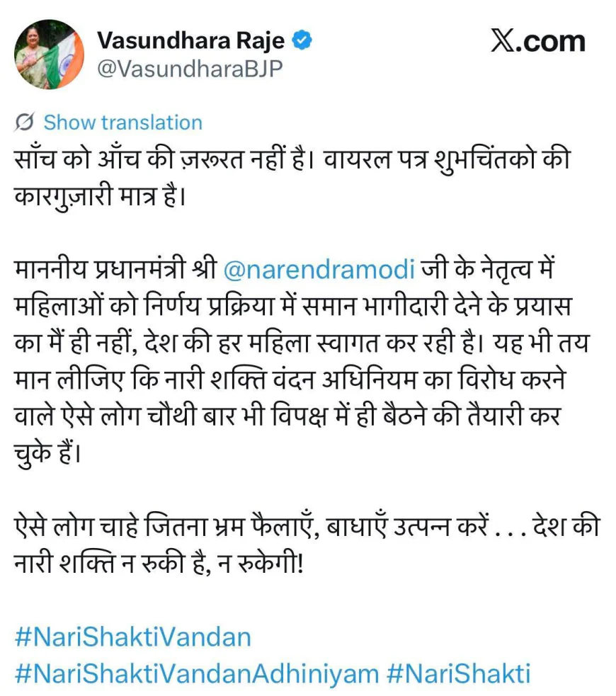 वायरल पत्र पर वसुंधरा राजे का पलटवार ‘सांच को आंच नहीं’, महिला आरक्षण पर सरकार के साथ मजबूती से खड़ी दिखीं”